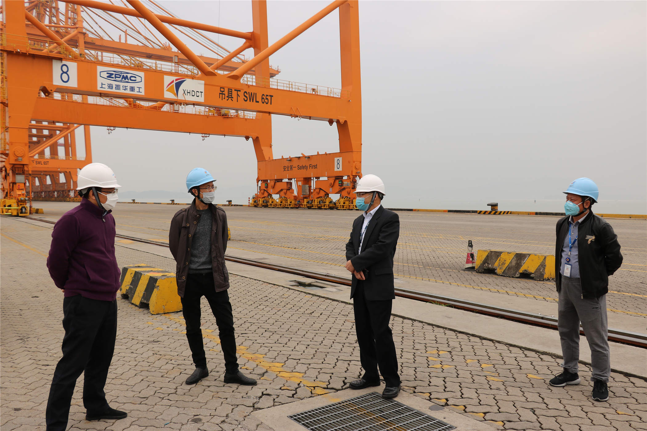 2月11日上午,港务控股集团蔡立群副总经理、集装箱集团副总经理许正一行赴新海达码头视察内贸箱生产作业和生产一线防疫工作落实情况,公司总经理吕建平及主要负责人等陪同。